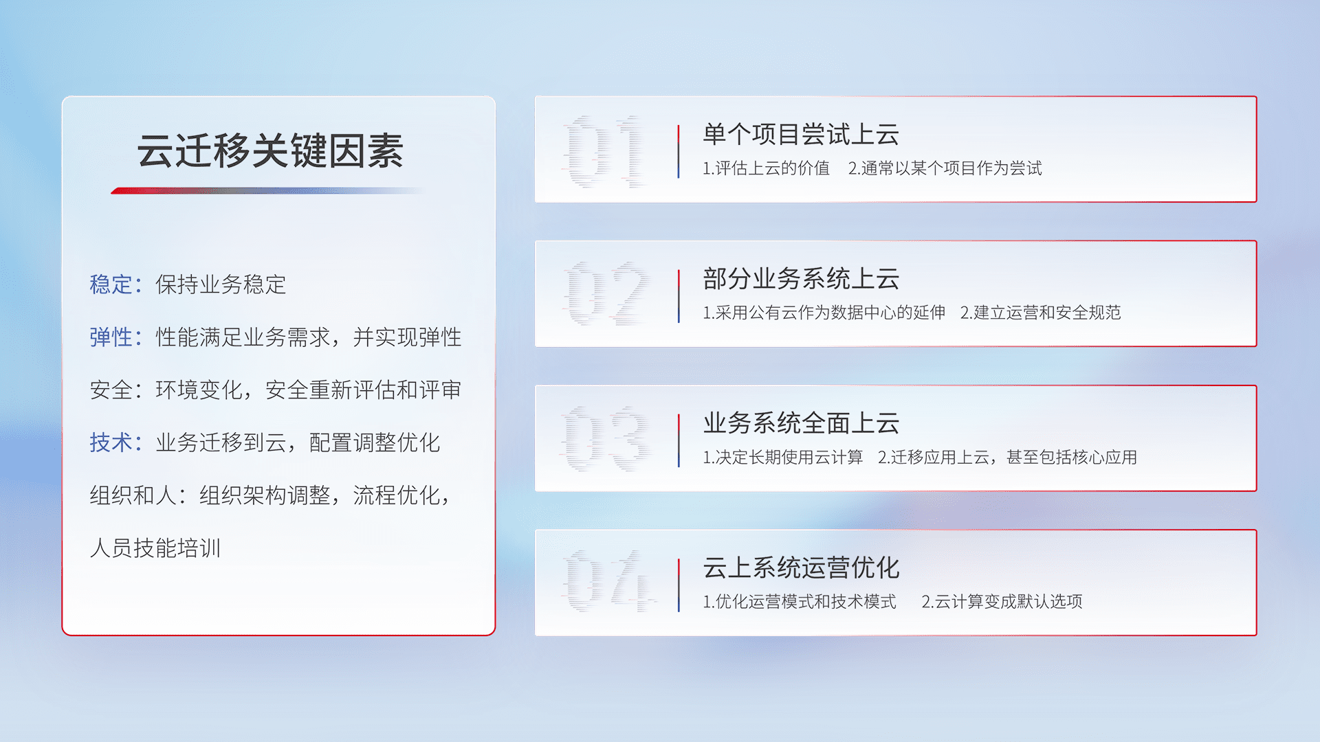 结合实际业务,,,从规划设计、、、、云平台选型、、、云原生改造、、数据迁移、、、、集成交付,,,迁移全过程为客户识别最佳上云路径,,,,做好风险识别管理,,设计网络架构、、、身份权限、、、安全审计合规、、、操作审计、、、、日志审计、、、、监控告警策略、、多站点容灾设计等,,对云上基础设施进行整体规划,,,,提升IT治理水平,,,,以满足弹性、、、、高可用、、高性能的需求。。。