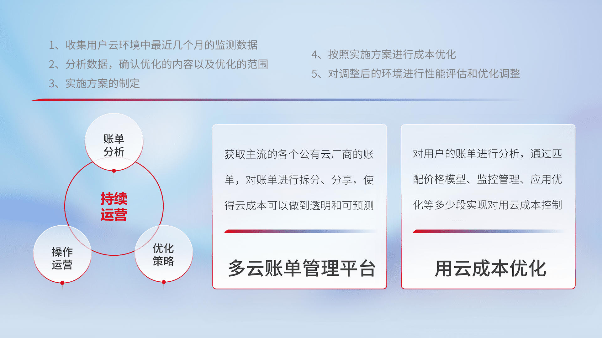 通过多云纳管,,以统一的资源数据模型把客户的云资源进行抽象和封装,,,,进而实现对多云资源的统一操作,,,,保障云资源管理的可靠性、、稳定性与可用性。。。。量身定制化运维内容,,,配置、、、开发运维、、补丁管理、、、备份、、、监控、、认证和访问管理、、、审计和日常巡检等,,,保障在用云过程中的可靠度,,,稳定度以及高可用率。。。