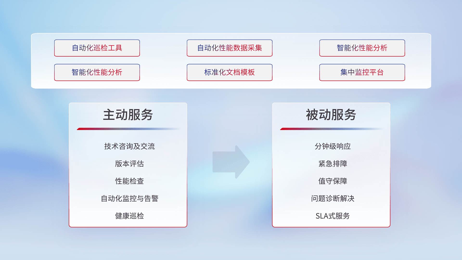 智能化工具和标准化文档,,,保障服务质量,,,提供主动服务(包含技术咨询、、、、版本评估、、、性能检查、、、自动化监控与告警、、健康巡检)和被动服务包含(分钟级响应、、、紧急排障、、、值守保障、、问题诊断解决、、、、SLA服务)。。。